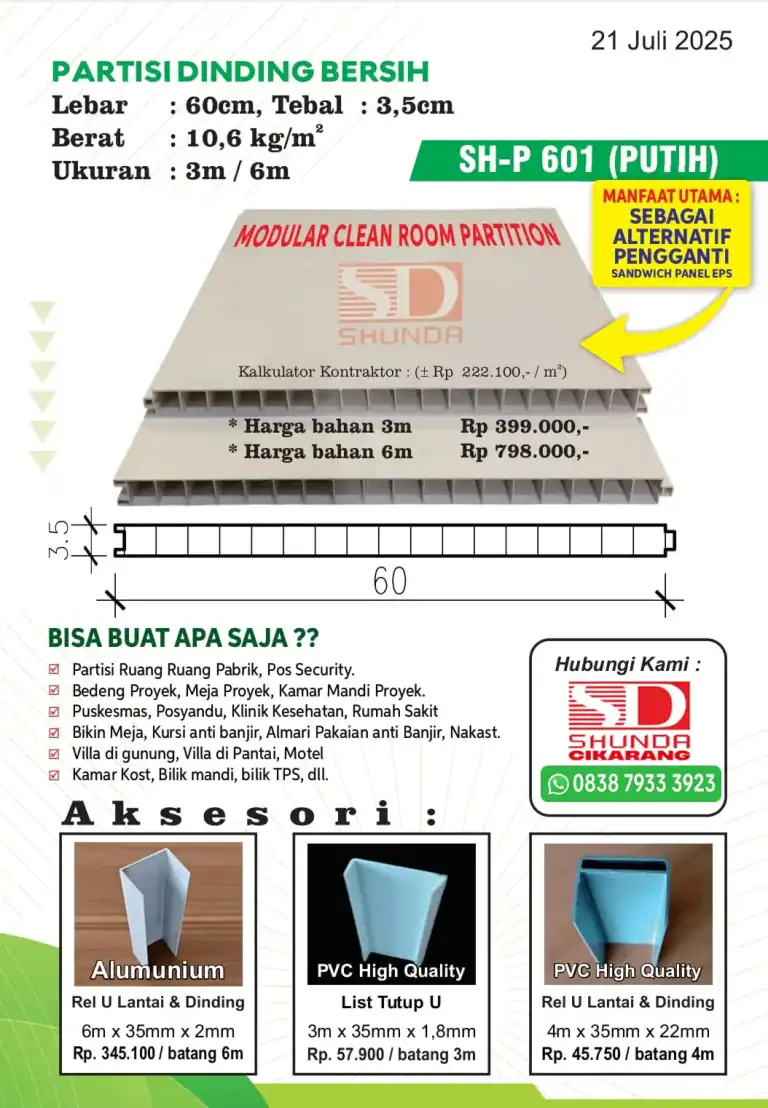Partisi Dinding Bersih sebagai alternatif pengganti Sandwich Panel EPS juga dilengkapi dengan aksesoris seperti Rel U Aluminium dan Dinding, List Tutup U PVC, dan Rel U PVC Lantai & Dinding.Â